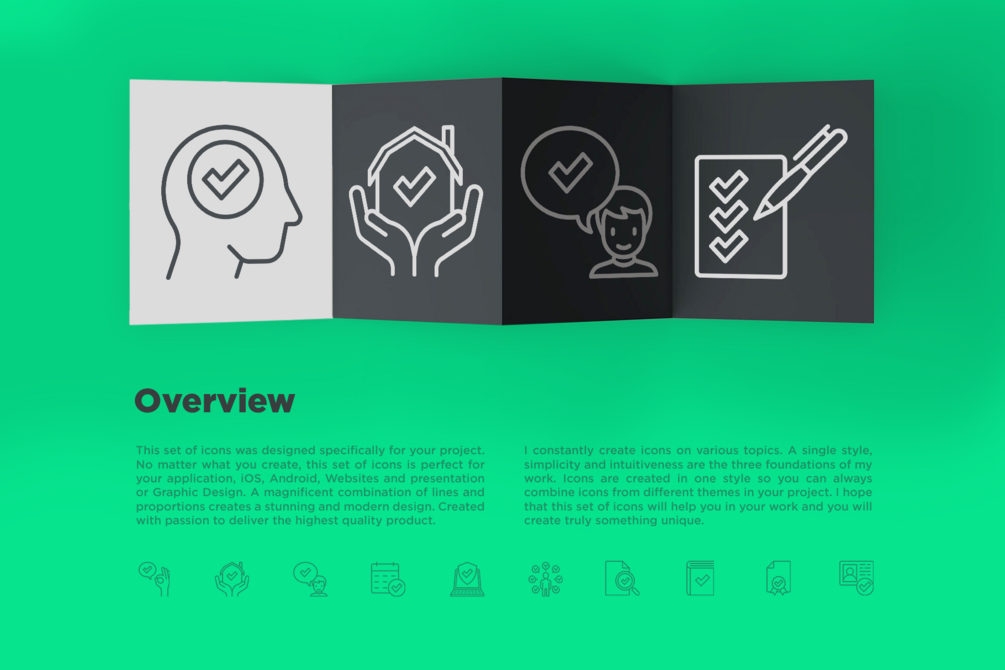 I constantly create icons on various topics. There are already several thousand icons in my collection. A single style, simplicity and intuitiveness are the three foundations of my work. Icons are created in one style so you can always combine icons from different themes in your project. I hope that this set of icons will help you in your work and you will create truly something unique.