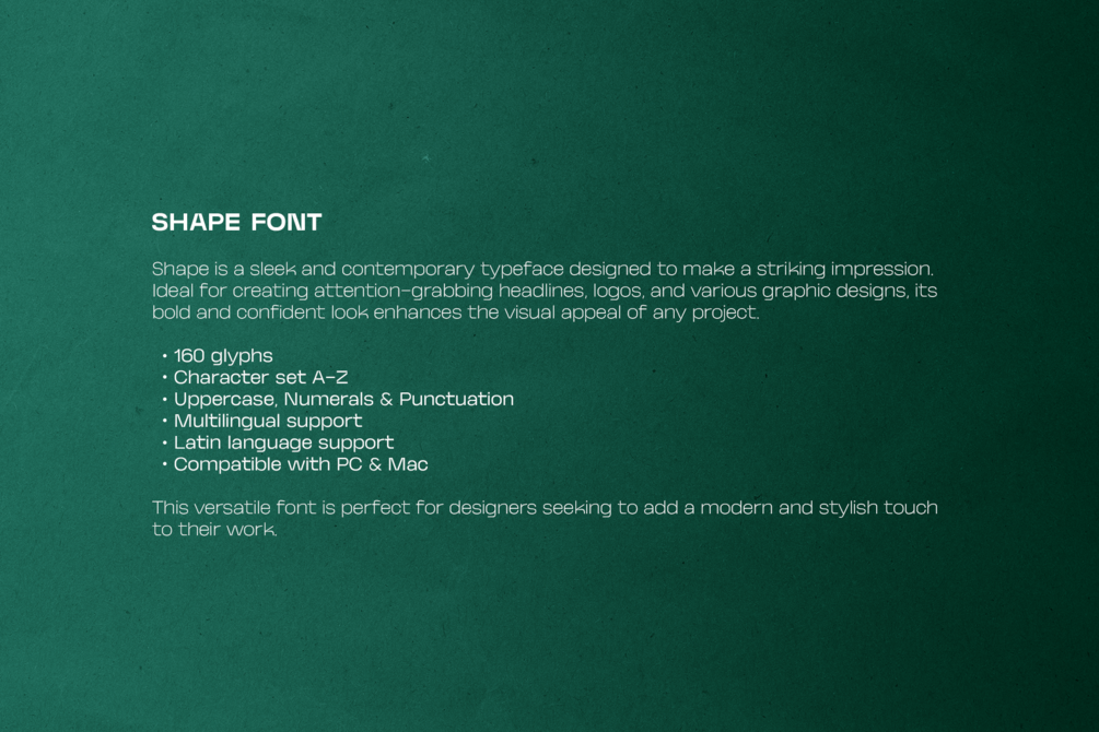 Shape is a sleek and contemporary typeface designed to make a striking impression. Ideal for creating attention-grabbing headlines, logos, and various graphic designs, its bold and confident look enhances the visual appeal of any project. Shape Font packs a set of uppercase, numbers and punctuation.